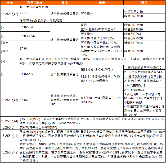 在57–64 GHz频带内销售或运行的现场干扰传感器/雷达设备,经电信认证机构批准,符合之前通过的规则或(规则生效日期后六个月)之前的豁免,可继续根据其认证进行销售和运行。所有其他现场干扰传感器/雷达设备应符合§15.255的要求。